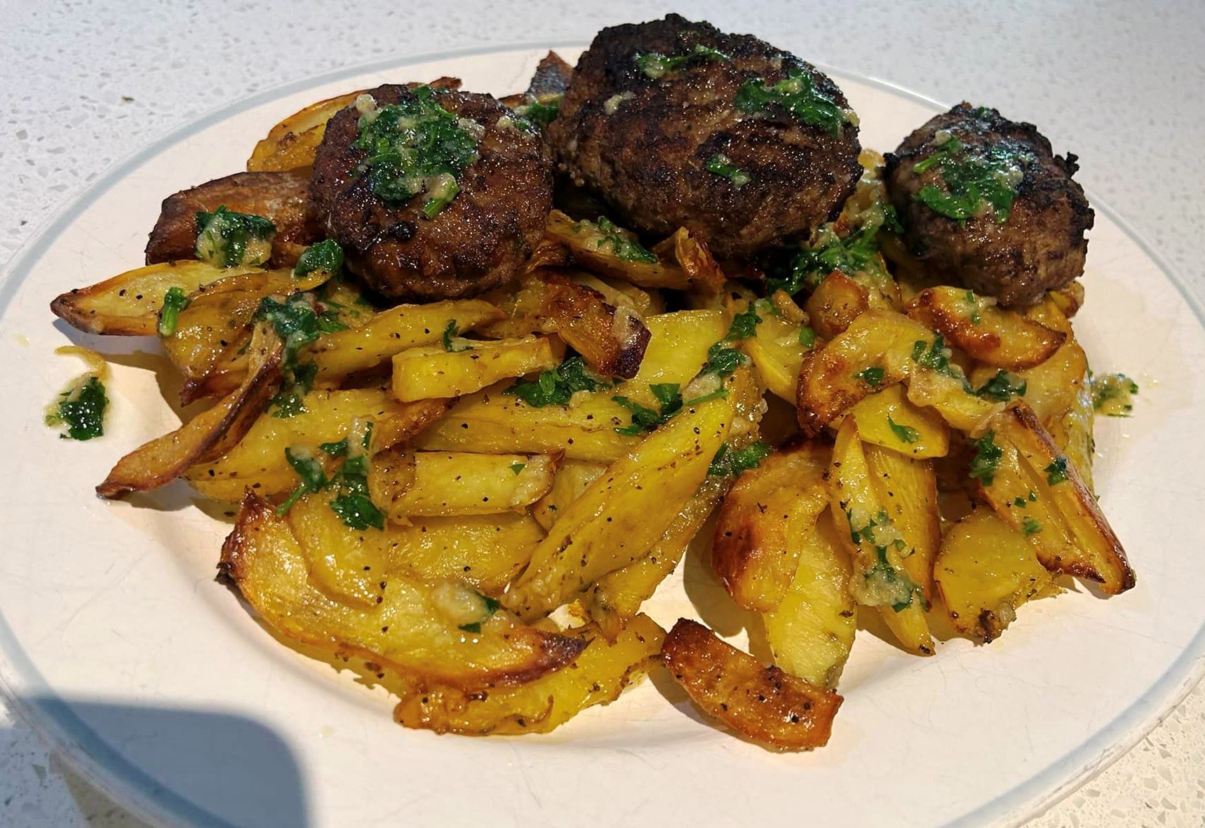 Πατάτες φούρνου με σκόρδο και ζουμερά μπιφτέκια.