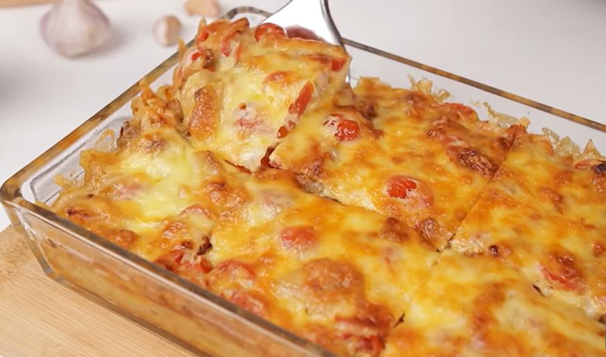 Βγάζουμε το πυρέξ απ τον φούρνο ρίχνουμε το μείγμα από πάνω απλώνουμε να πάει παντού και τέλος πασπαλίζουμε το τυρί.