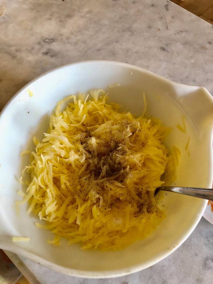 Τρίβουμε της πατάτες μέσα σε ένα μπολ και αμέσως μετά τις στίβουμε πολύ καλά.
