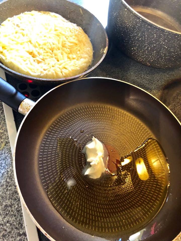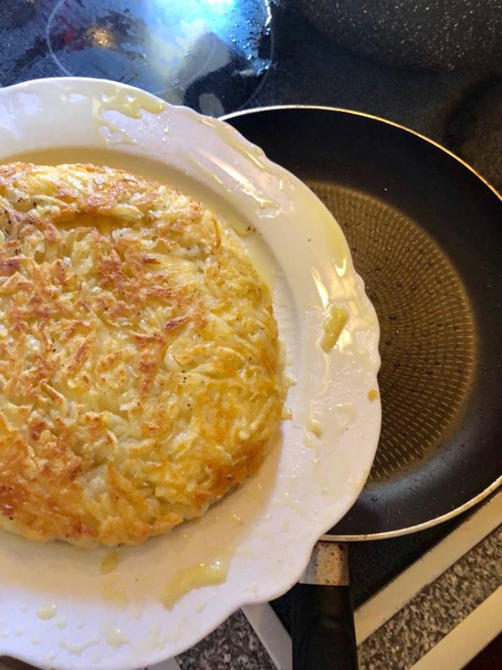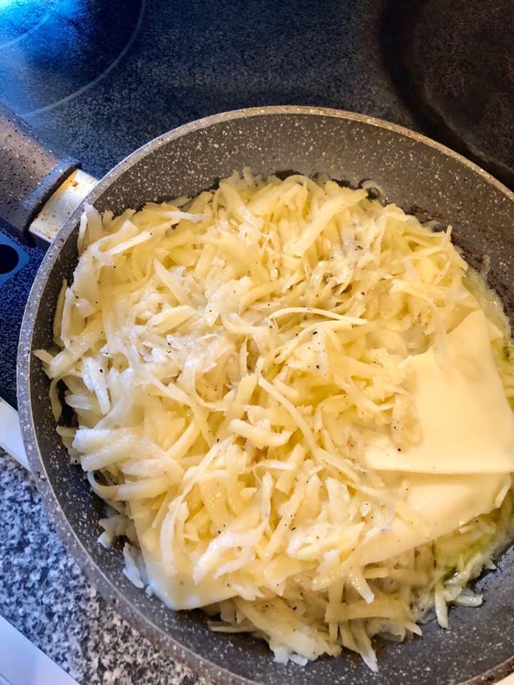 Βάζουμε στο τηγάνι λίγο λάδι μαζί με μία κουταλιά βούτυρο και μόλις λιώσει κάνουμε μία παχιά στρώση από την τριμμένη πατάτα στρώνοντας ομοιόμορφα -το τηγάνι να έχει μέγεθος μικρού πιάτου ρηχού.