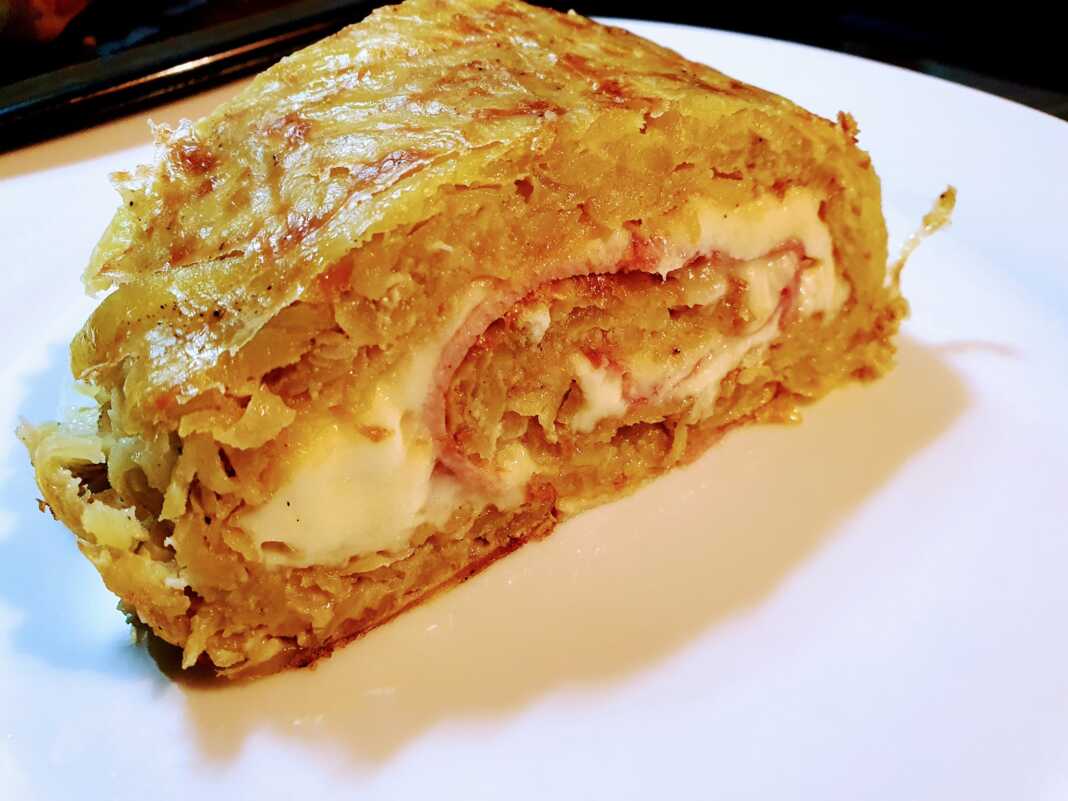 Ψήνω για 20 με 25 λεπτά στους 170 βαθμούς ,βγάζω από το φούρνο αφήνω να κρυώσει λίγο (για να μπορέσω να το τυλίξω μετα) και βάζω γκούντα ,μοτσαρελα κ τ αλλαντικά (ότι θέλετε)