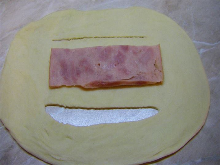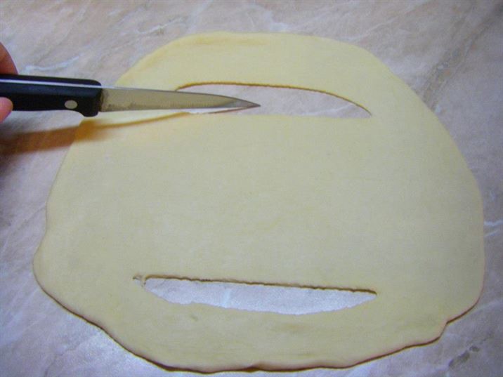 Ανοίγουμε κάθε μπάλα ζύμης σε σχήμα οβάλ, τοποθετούμε στη μέση την γέμιση και πλάθουμε ως εξής (όπως βλέπετε από τις φωτογραφίες “βήμα βήμα”) .