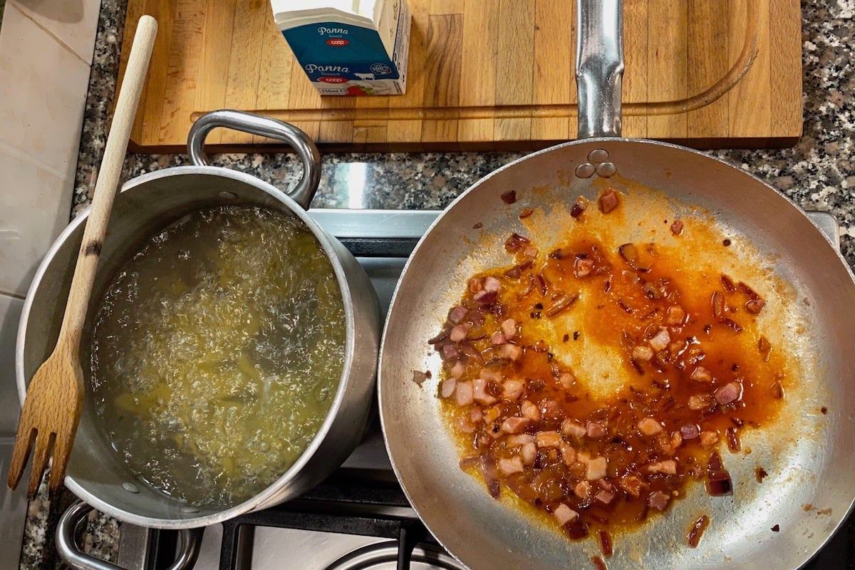 και τελειώστε το μαγείρεμα με λίγες προσθήκες βραστό νερό. Όταν τελειώσει το μαγείρεμα, σβήστε τη φλόγα, προσθέστε τριμμένη παρμεζάνα και ανακατέψτε. Το τελικό πιάτο πρέπει να έχει έναν πλούσιο και κρεμώδη σάλτσα, οπότε αν είναι απαραίτητο προσθέστε λίγο νερό ζυμαρικών και ανακατεύετε. Σερβίρετε ζεστό. Γεμίστε με λίγο παρμεζάνα και λίγο αλεσμένο μαύρο πιπέρι αν θέλετε.