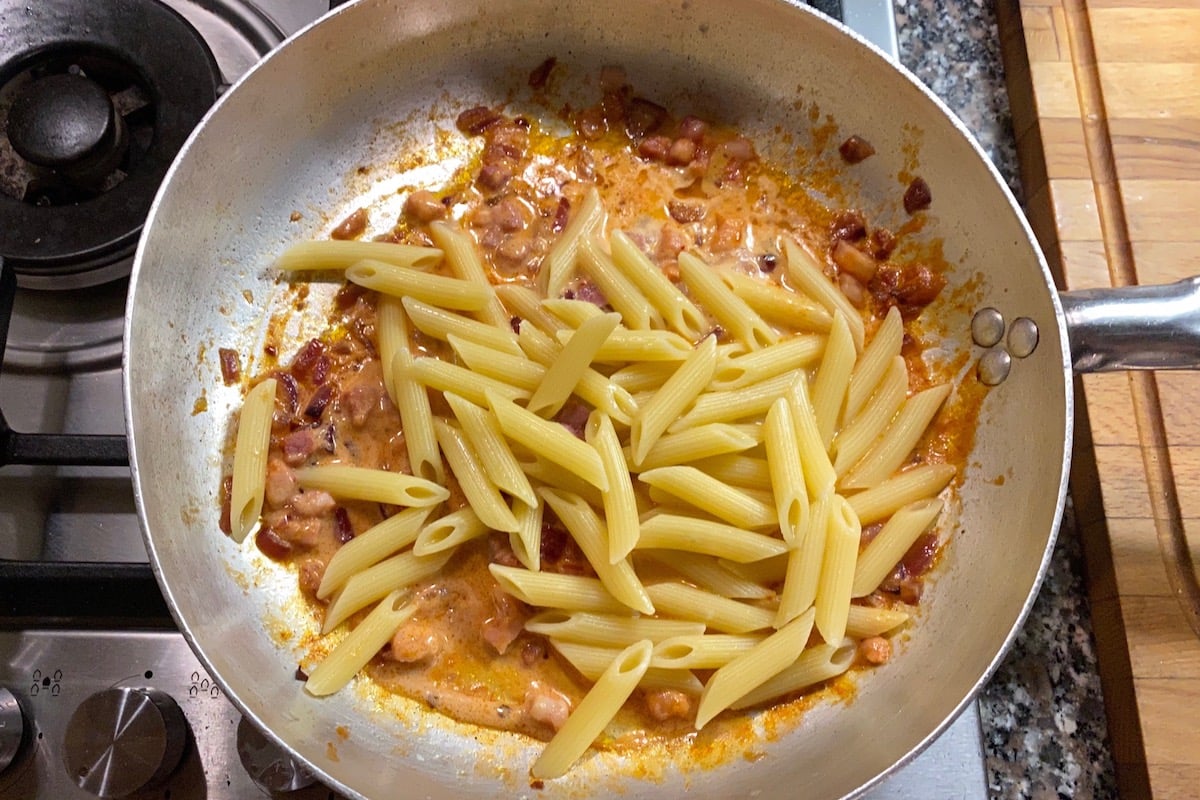 Λίγο πριν οι πέννες είναι έτοιμες από το βρασιμο ανοίξτε τη φλόγα κάτω από το τηγάνι, ρίχνουμε τη φρέσκια κρέμα, ανακατεύουμε και δοκιμάζουμε.