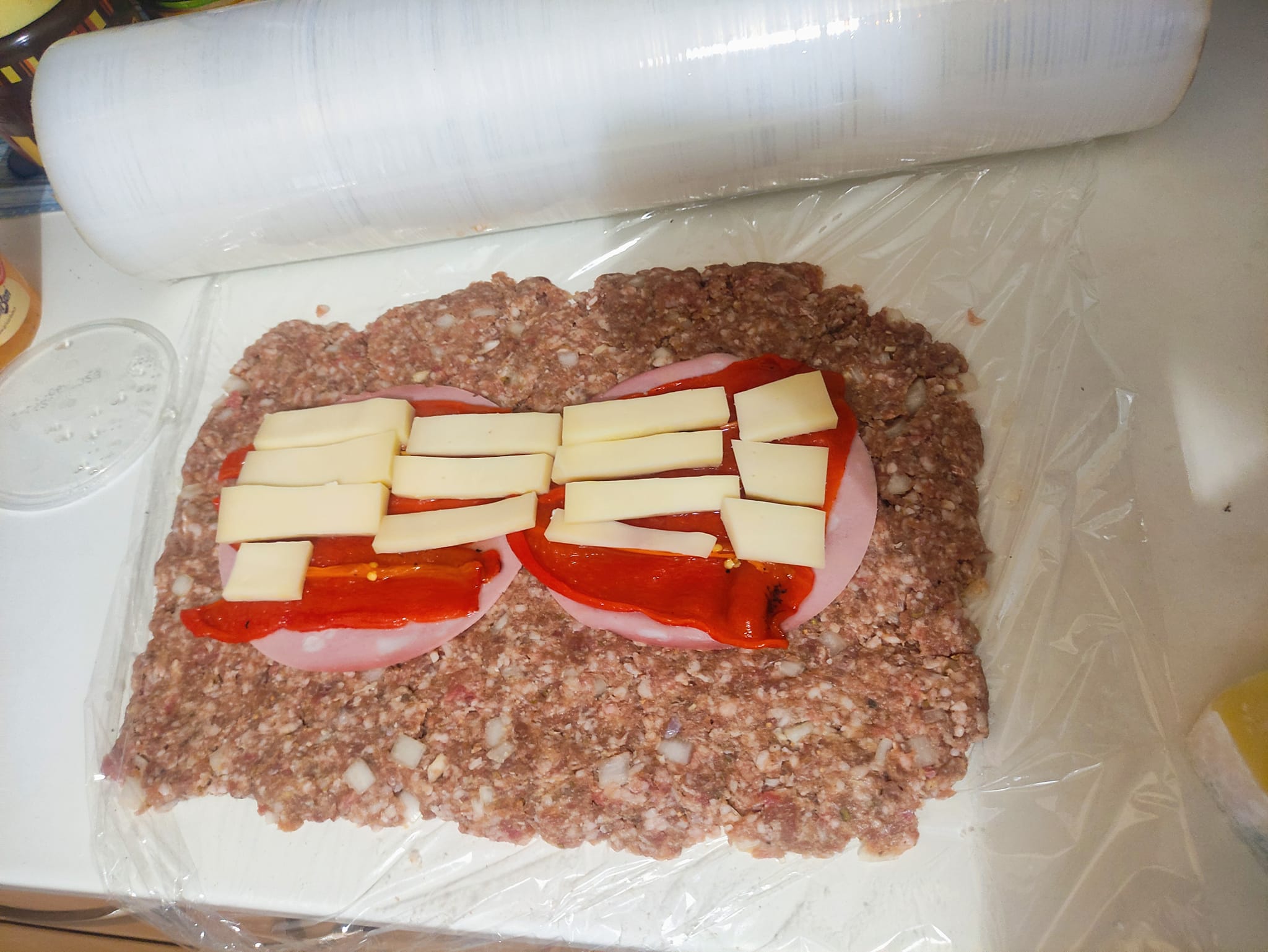 Ρολό κιμά γεμιστό με μορταδέλα ψητές κόκκινες πιπεριές και κασέρι, με πατάτες και πιπεριές ψημένες στο φούρνο