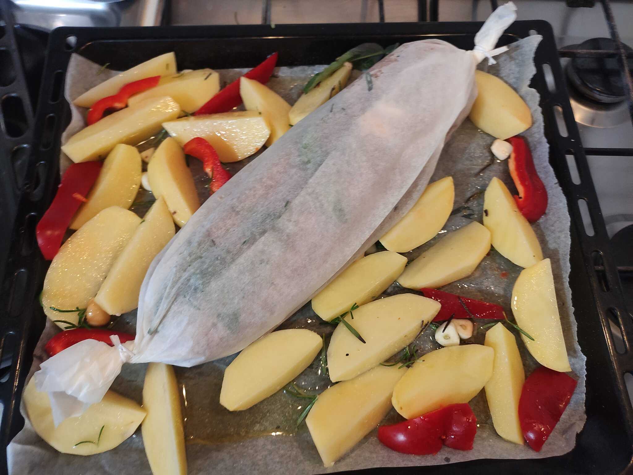 Βάζετε το ρολό στο ταψι προσθέτετε τις πατάτες το πιπέρι το αλάτι το δεντρολίβανο το λάδι και ψήνετε στους 180° μέχρι να ροδίσουν οι πατάτες περίπου 45min