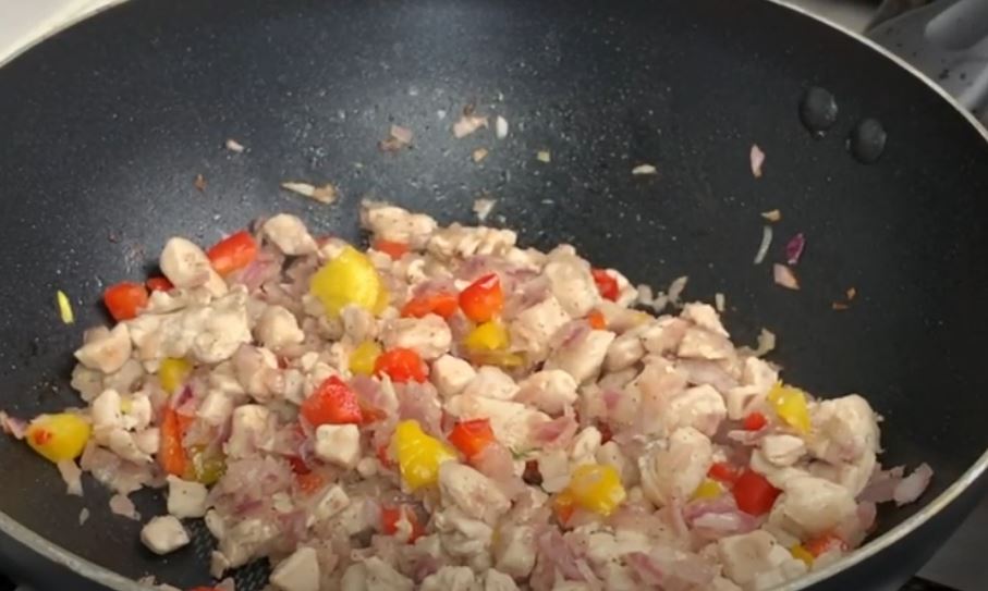 Ξεκινάμε βάζοντας ένα τηγάνι βαθύ με 1 κσ λάδι σε μέτρια φωτια και ριχνουμε το κοτόπουλο και σοτάρουμε μέχρι να ασπρίσει.