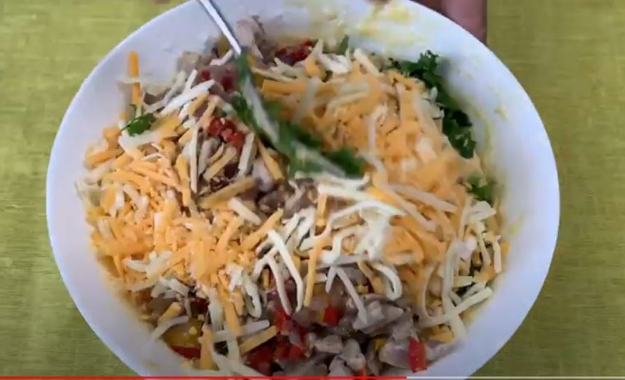 Σε ένα μπολ χτυπώ τα αυγά, προσθέτω το αλεύρι το μαγειρεμένο σπανάκι και το μείγμα κοτόπουλου τριμμένο τυρί και ανακατεύω όλα μαζί και προσθέτω και 1/2 κσ κόλιανδρο και 1/2 κσ πιπέρι και 1/2 κσ αλάτι και ανακατεύω πάλι.