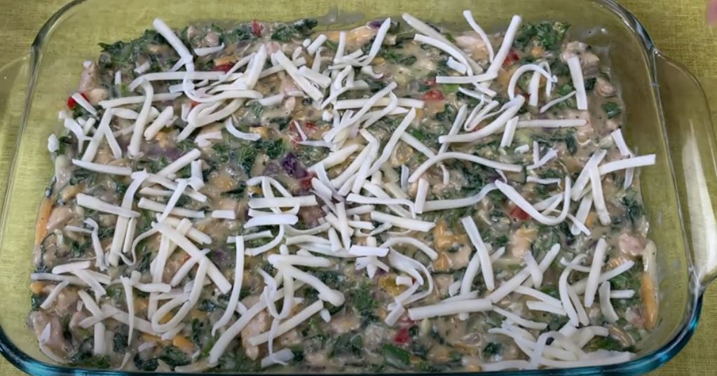 Λαδώνω ένα πυρέξ και απλώνω το μείγμα και πασπαλίζω με τυρί τριμμένο