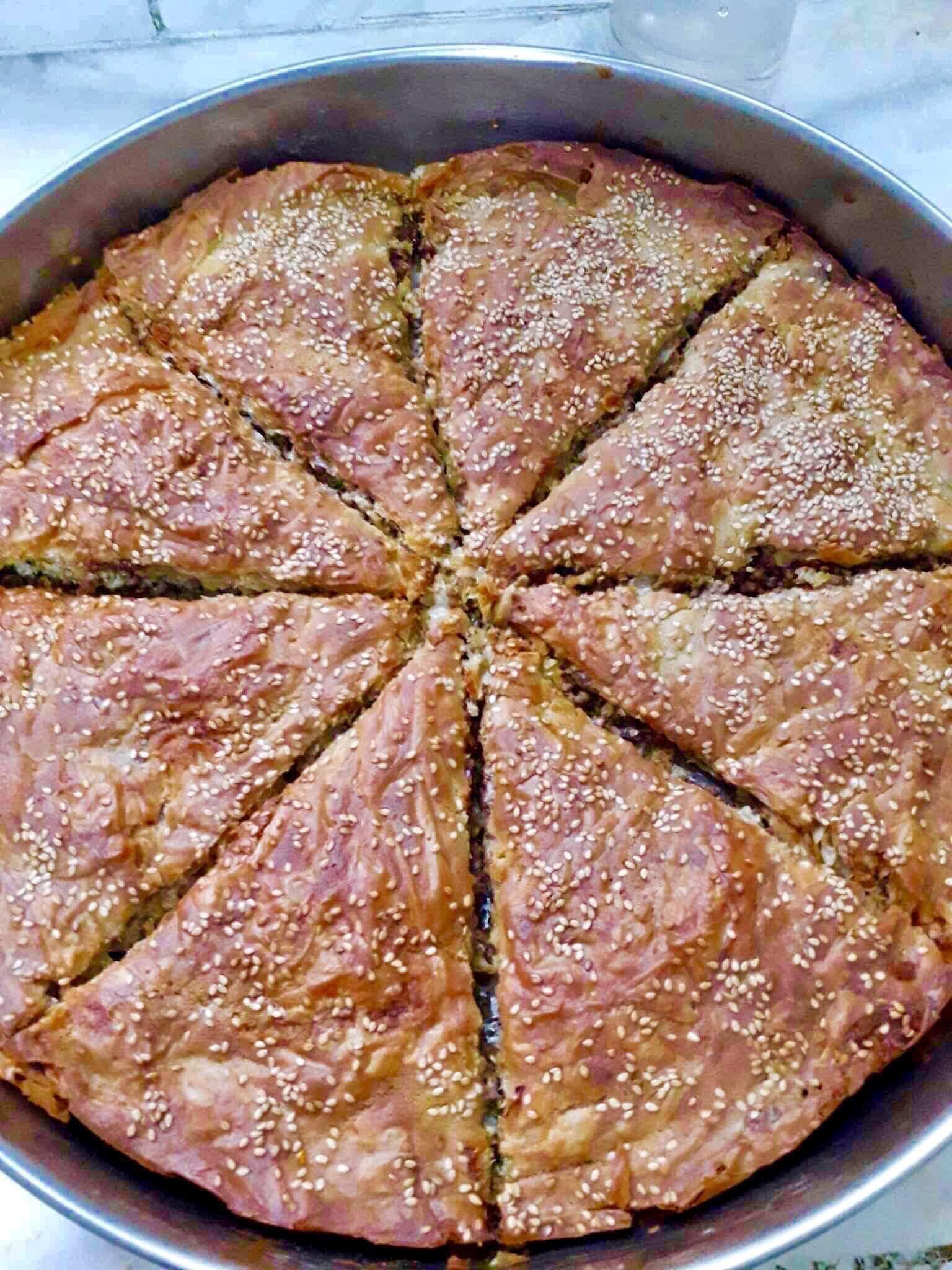 Εβαλα ενα κιλο κιμα να τσιγαριστει με κρεμμυδι προσθεσα αλατι πιπερι κοκκινη παπρικα γλυκια,μιση κουταλια πελτε και αφησα να βρασει να πιει το ζουμι του..αν θελετε παει πολυ και ψιλοκομμενο μπεικον …εστρωσα λαδωμενα φυλλα κρουστας προσθεσα τον κιμα αφου χλιαρηνε και εκλεισα με τα υπολοιπα φυλλα ..εριξα λαδακι πιτσιλισα με νερο και τελος σουσαμακι..εψησα στους 180