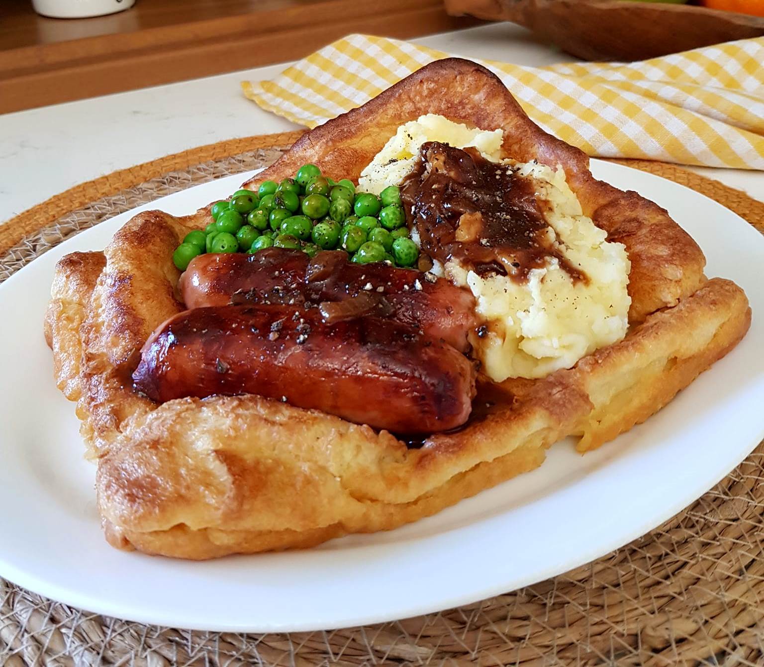 Σερβίρετε αμέσως με πουρέ, λουκάνικα, αρακά και την σάλτσα.