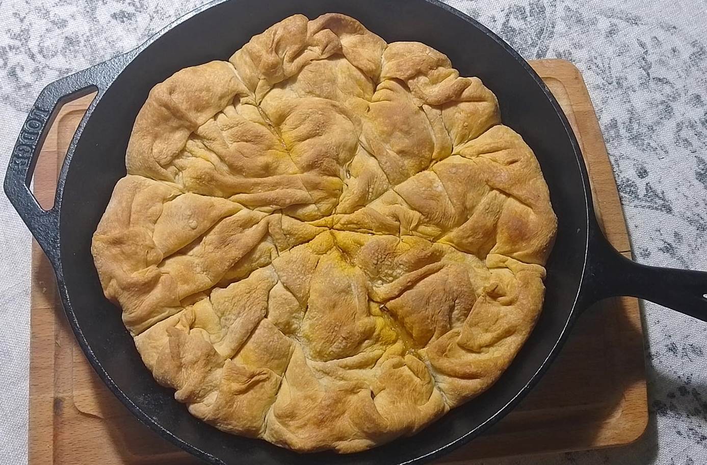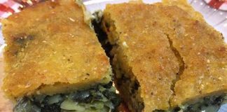 Παίρνουμε το ταψί, το λαδώνουμε και πάλι και τοποθετούμε την πίτα με την άψητη πλευρά από κάτω και συνεχίζουμε την ίδια διαδικασία ψησίματος….. Όταν ψηθεί την αφήνουμε για λίγο να κρυώσει και κόβουμε σε κομμάτια της αρεσκείας μας……Η όλη μαστοριά είναι στο ΓΡΗΓΟΡΟ αναποδογύρισμα της πίτας, θα πρέπει να έχουμε αλευρώσει την πλασταριά να μη μας κολλήσει το ζυμάρι, μην τυχόν και δεν γλιστρήσει εύκολα όταν θα την ξαναβάλουμε στο ταψί, καθώς επίσης και να μην μείνει για πολλά δευτερόλεπτα στην πλασταριά…..