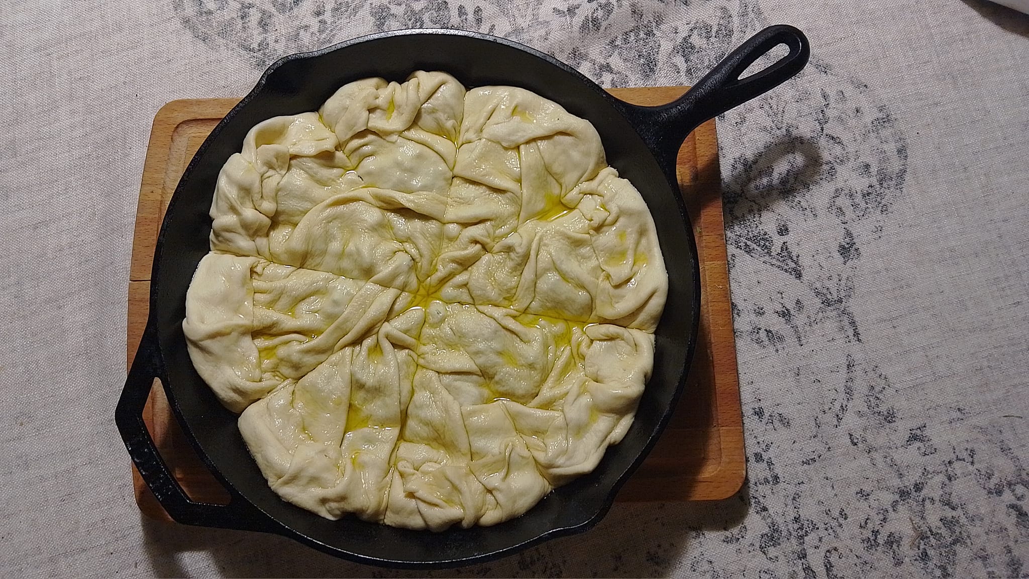 σε διάμετρο λίγο μεγαλύτερη (3 εκατοστά) από τη διάμετρο του ταψιού. Την ίδια διαδικασία επαναλαμβάνουμε και με τις άλλες τρεις μπάλες ζύμης και έχουμε δύο τριπλά φύλλα. Λαδώνουμε το ταψί μας, τυλίγουμε το φύλλο στο πλαστήρι και το τοποθετούμε ξετυλίγοντάς το στο ταψί. Θα πρέπει να προεξέχει 3 περίπου εκατοστά, αν είναι μεγαλύτερο το κόβουμε με το ψαλίδι. Βάζουμε τη γέμιση σε όλη την επιφάνεια ξεκινώντας από τη μέση του φύλλου και καλύπτουμε με το άλλο φύλλο, το οποίο αν περισσεύει και είναι μεγαλύτερο το κόβουμε με το ψαλίδι, θα πρέπει να είναι ίσα ίσα με την άκρη του ταψιού μας.