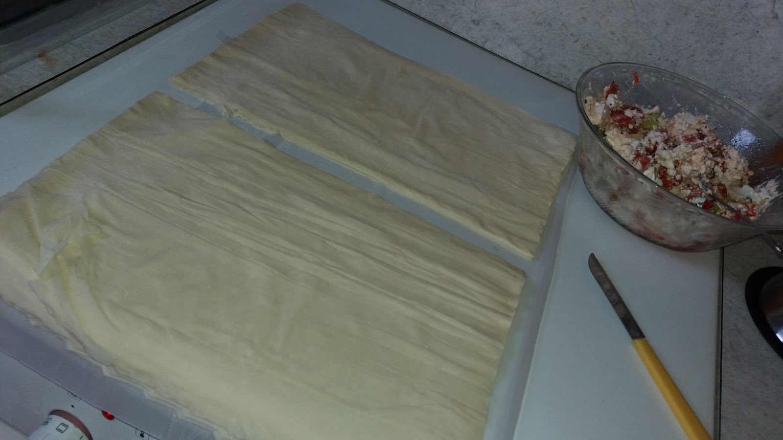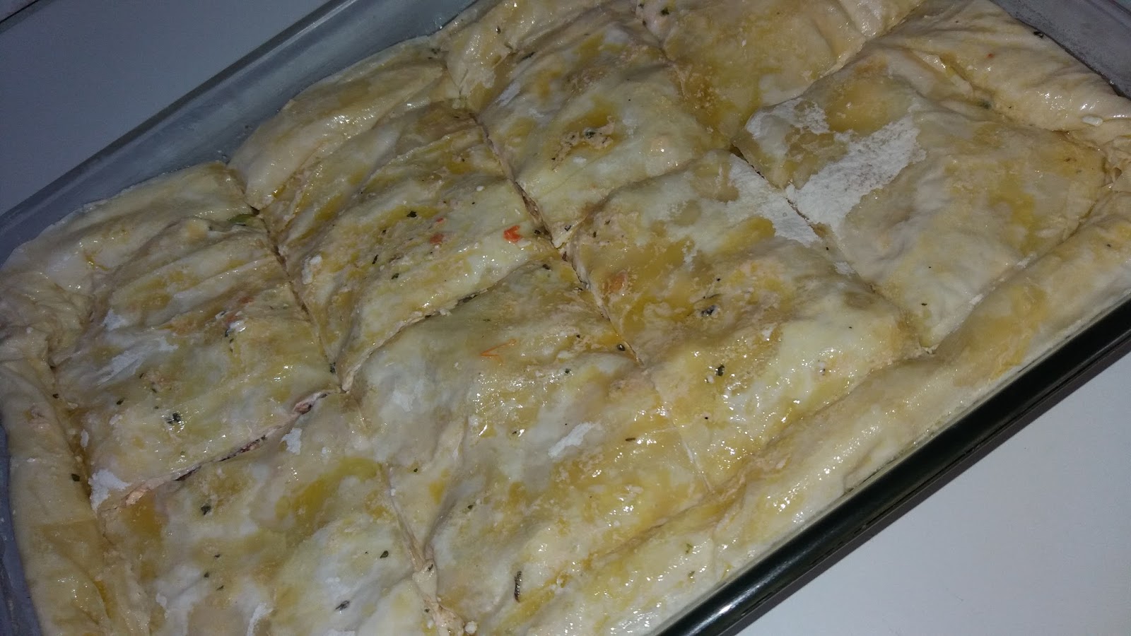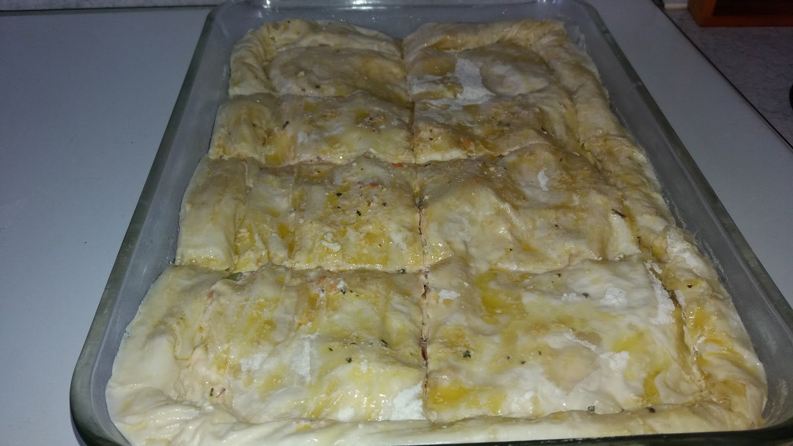 Ααα και το μυστικό.. αν δεν έχουμε φύλλο χωριάτικο κάνουμε το κρούστας να μοιάζει σαν χωριάτικο πως; ρίχνοντας αλεύρι στα φύλλο καθώς τα στρώνουμε στο ταψί…