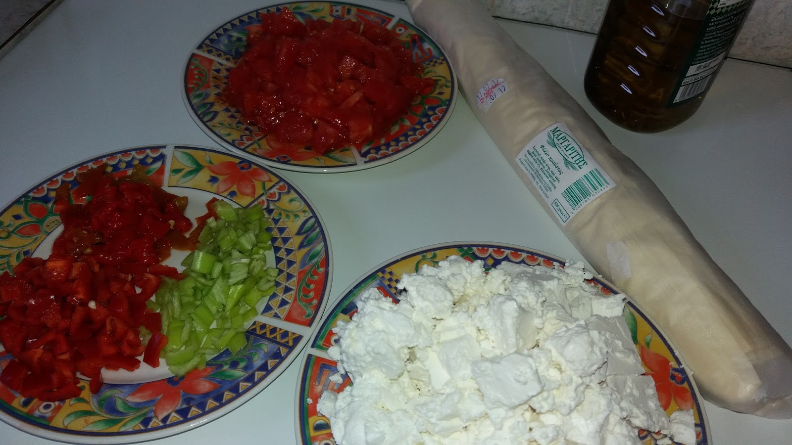 Κόβουμε τις πιπεριές και τη ντομάτα σε μικρά κυβακια, θριματιζουμε το τυρί. Ενώνουμε τα υλικά μας σε ένα μπολ, προσθέτουμε αλάτι πιπερι ρίγανη, προσέχουμε με το αλάτι, συνήθως το νηστίσιμο το τυρί δεν είναι αλμυρό γιαυτό προσθέτουμε, αν δοκίμασουμε και είναι αλμυρο δε βάζουμε καθόλου.