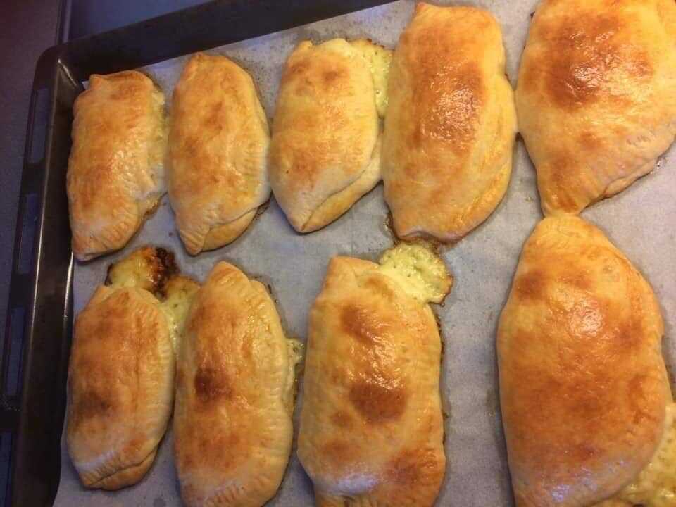 Βαζουμε τα τυριά και κλεινουμε μισοφεγγαρο. Αλοιψουμε με λιγο αυγο.