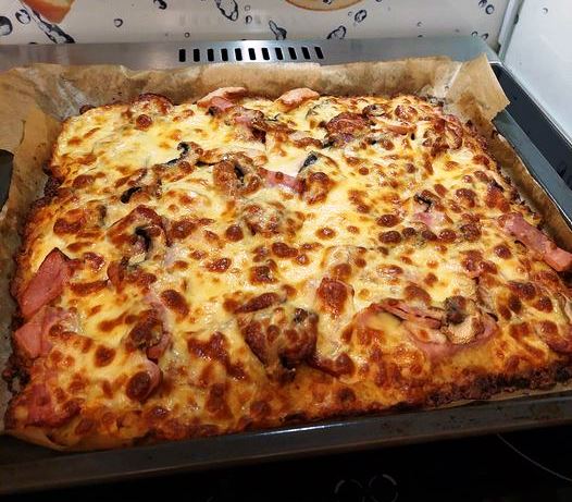 Ψήνω τη βάση σε προθερμασμένο φούρνο στους 220°C για περίπου 30 λεπτά. Εν τω μεταξύ, ετοιμάζω το κάλυμμα της πίτσας. Μπορώ να χρησιμοποιήσω προϊόντα σύμφωνα με τις προτιμήσεις και τις επιλογές μου.