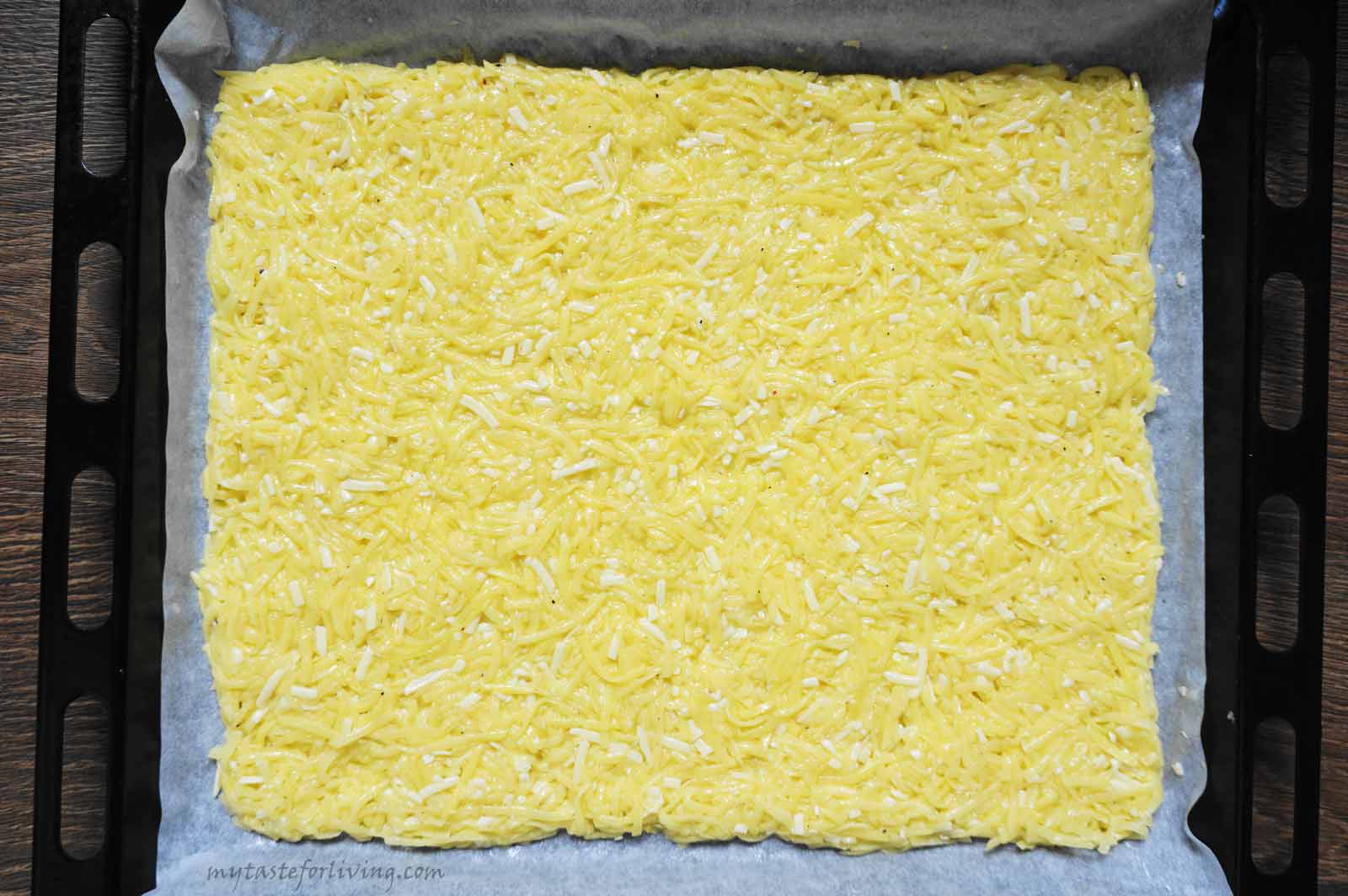 Είναι πολύ σημαντικό να στραγγίσετε πολύ καλά τις τριμμένες πατάτες για να μη βγάλουν υγρά κατά το ψήσιμο. Αυτό είναι το μυστικό για μια τραγανή βάση.