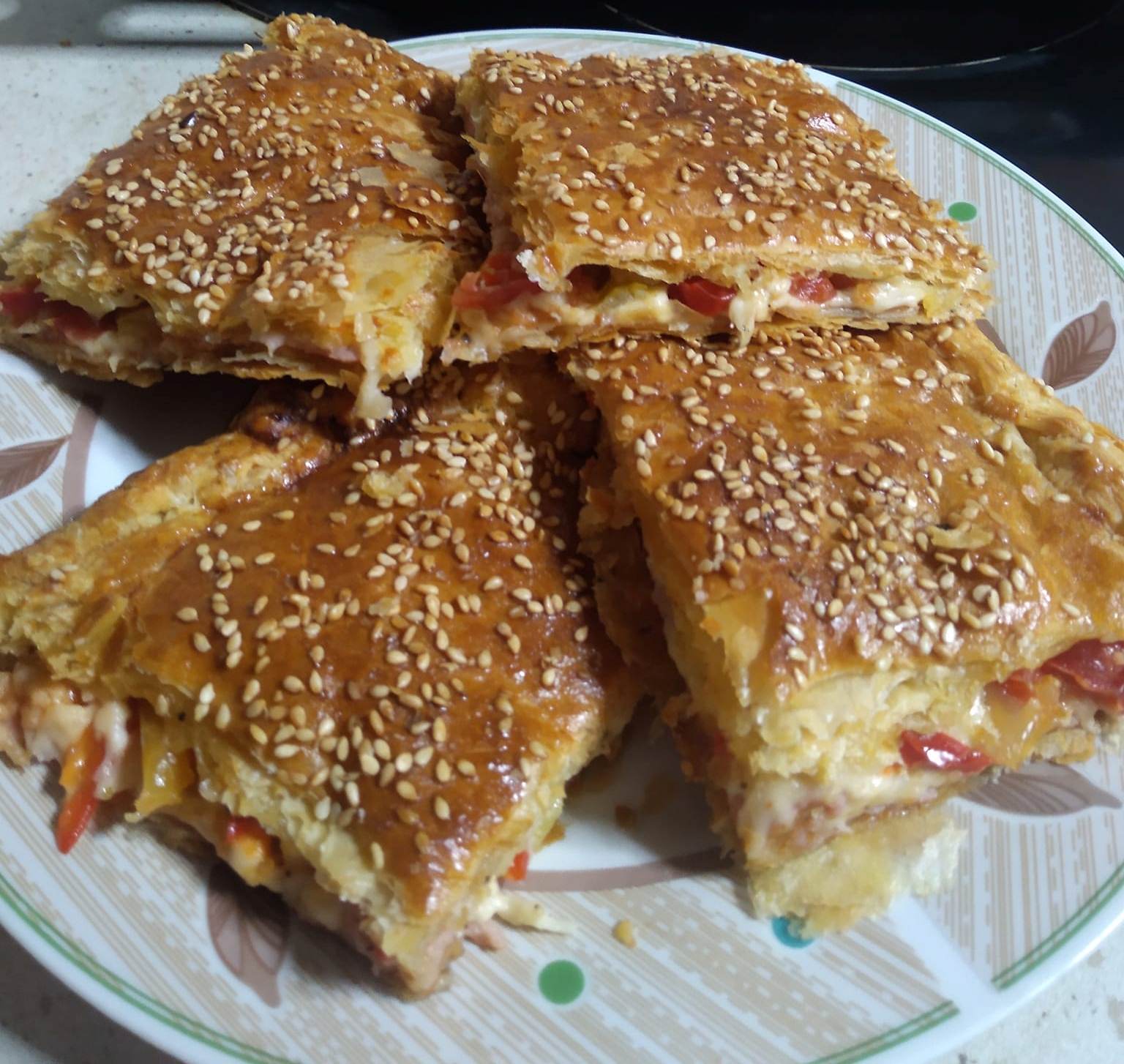 Έβαλα πάριζα,τυρί γκούντα,πιπεριές,και ντομάτα και έκλεισα με το άλλο φύλλο σφολιάτας.
