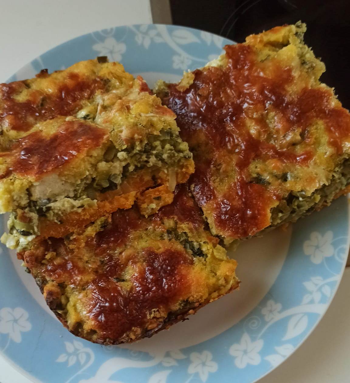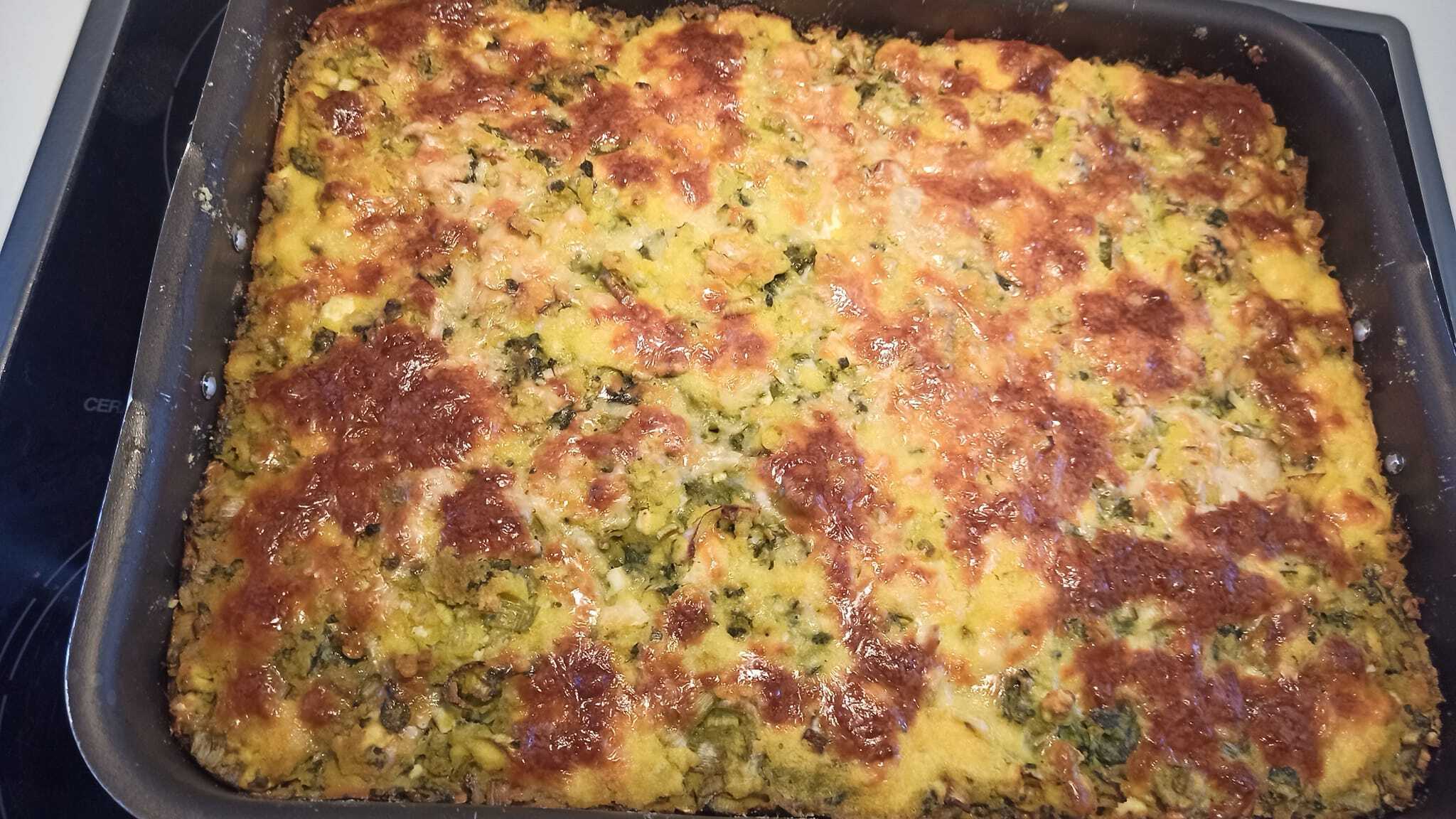 δύο κουταλιές καλαμποκαλευρο και τυρι τριμμένο. Βαζουμε τή γέμιση και από επάνω απλώνουμε επτά κουταλιές καλαμποκαλευρο