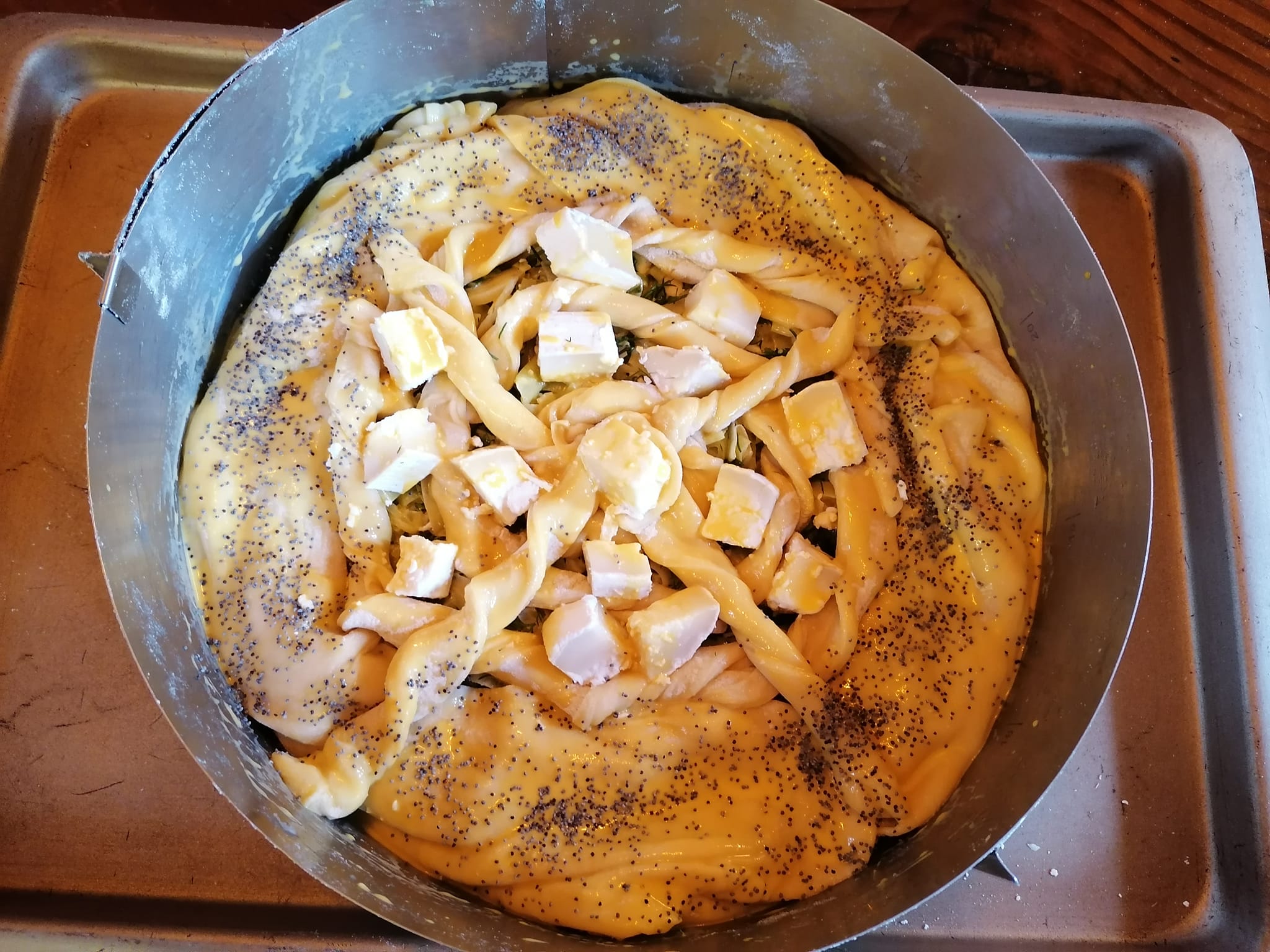 Με την άλλη κρούστα κάνω ένα δίχτυ από πάνω (Ανοίγω το δεύτερο φύλλο, που προηγουμένως λαδώνω και δίπλωσα σε φάκελο, κόβω σε λωρίδες και στρίβω σε σπείρα. Η ζύμη είναι πολύ απαλή και τη δουλεύεις σαν σφολιάτα), αλείφω με κρόκο χτυπημένο με 2 κουταλιές κρέμα γάλακτος, ψήνω στους 190 βαθμούς για 45 λεπτά
