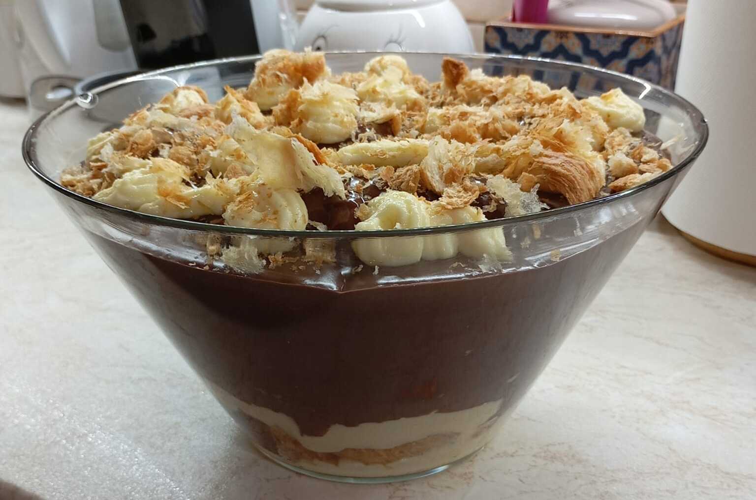 Γαρνίρουμε με κρεμα και τριμμενα κρουασανακια και αφήνουμε το γλυκό στο ψυγείο για τουλάχιστον 2 ώρες πριν το σερβίρουμε.
