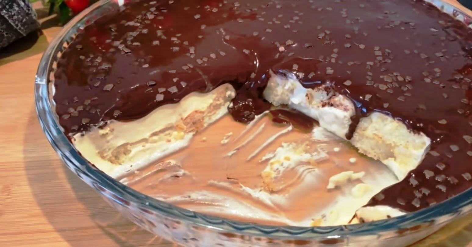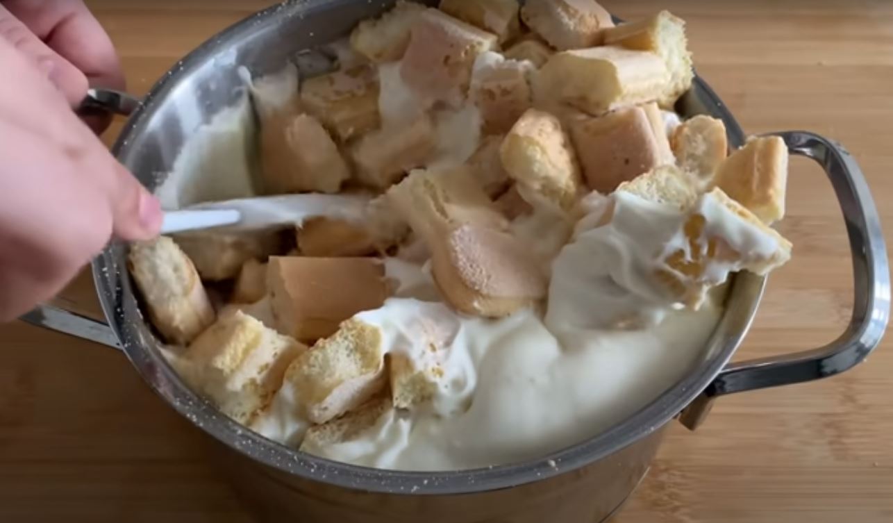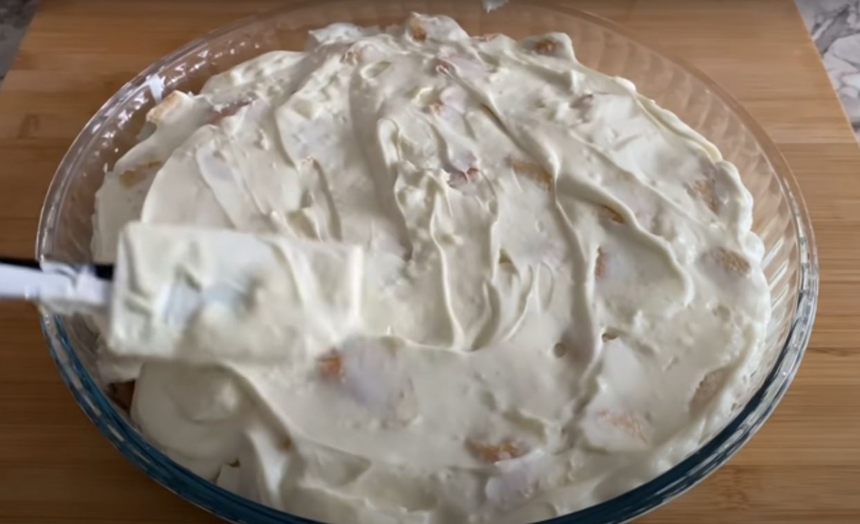 Στη συνέχεια μέσα στην κρέμα σπάμε τα μπισκότα σαβαγιάρ και ανακατεύουμε με μία μαρίζ να καλυφθούν καλά. Αδειάζουμε το μείγμα σε ένα στρογγυλό πυρεξ και το ίσιωνουμε.