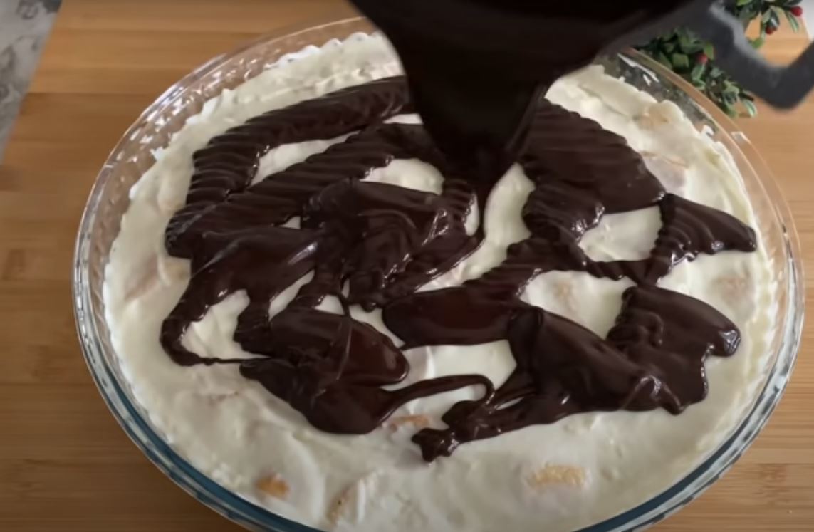 Αδειάζουμε το γλασσο πάνω από το γλυκό μας και το απλωνουμεμ από πάνω πασπαλίζουμε με τρούφα σοκολάτα ή μικρές νιφάδες κομματάκια