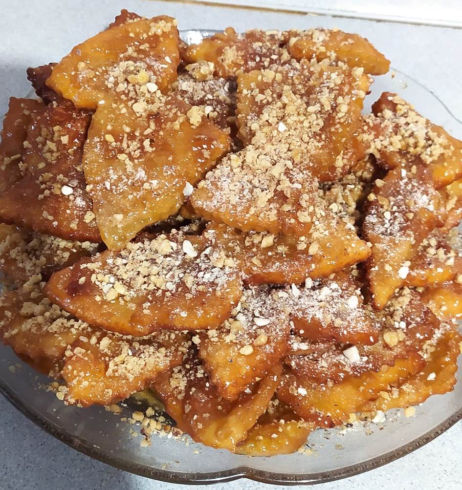Ανοίγω φύλλο λεπτό, το κόβω λουρίδες και φτιάχνω φιογκάκια ή κόβω σε τρίγωνα.
