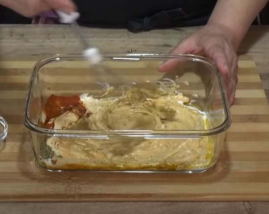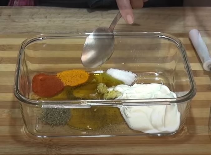 Σε ένα πυρέξ ρίχνουμε το σκόρδο, μαιντανό,πάπρικα, κουρκουμά, γιαούρτι,αλάτι, πιπέρι, 3 κουταλιές ελαιόλαδο και ανακατεύουμε με ένα σύρμα χειρός.