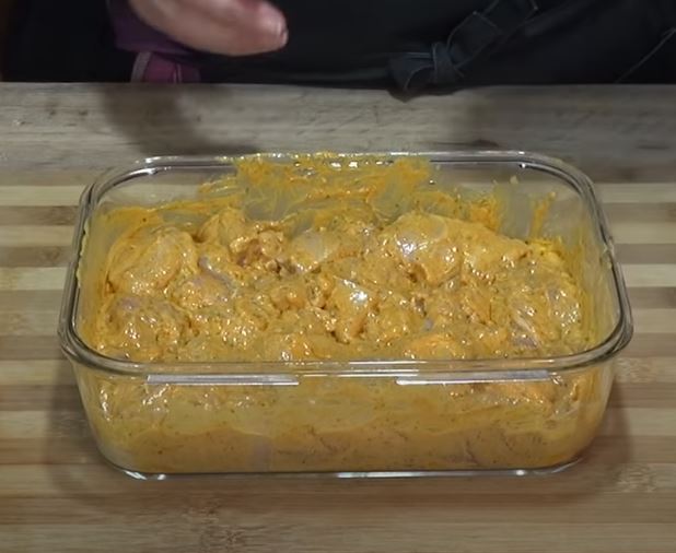 Ρίχνουμε και το κύμινο εάν σας αρέσει. Απλώνουμε μέσα στην σάλτσα το κοτόπουλο και τα ανακατεύουμε με τα χέρια μας να καλυφθεί πλήρως το κοτόπουλο.
