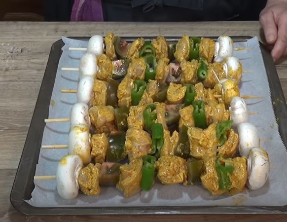 Παίρνουμε 6 καλαμάκια και σε κάθε καλαμάκι βάζουμε μανιτάρι – κοτόπουλο – ντομάτα – κοτόπουλο – πιπεριά κοτόπουλο – ντομάτα – κοτόπουλο – πιπεριά – κοτόπουλο – μανίταρι.