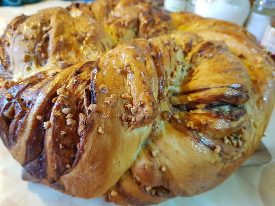 ζύμης όπως θέλετε. Η φόρμα είναι στρωμένη με χαρτί ψησίματος ή απλά βουτυρωμενο και πασπαλισμένο με αλεύρι. Τοποθετήστε τα πλεκτά brioches, τα οποία πρέπει να καταλαμβάνουν το μισό του ύψους της φόρμας. Αφήστε το να φουσκώσει ξανά. Απλώνουμε με ασπράδι αυγού και πασπαλίζουμε με υγρή ζάχαρη. Οταν το βγάλουμε το αλειφουμε με σιρόπι και πασπαλίζουμε με καρύδι