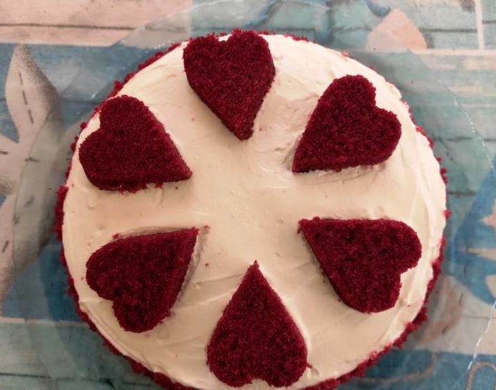 Στα πάνω μέρη που κόψαμε από τα κεικ μας βάζουμε τα κουπ πατ (καρδιές)που κάνουμε τα κουλουράκια μας και βγάζουμε 6-7 καρδιές.