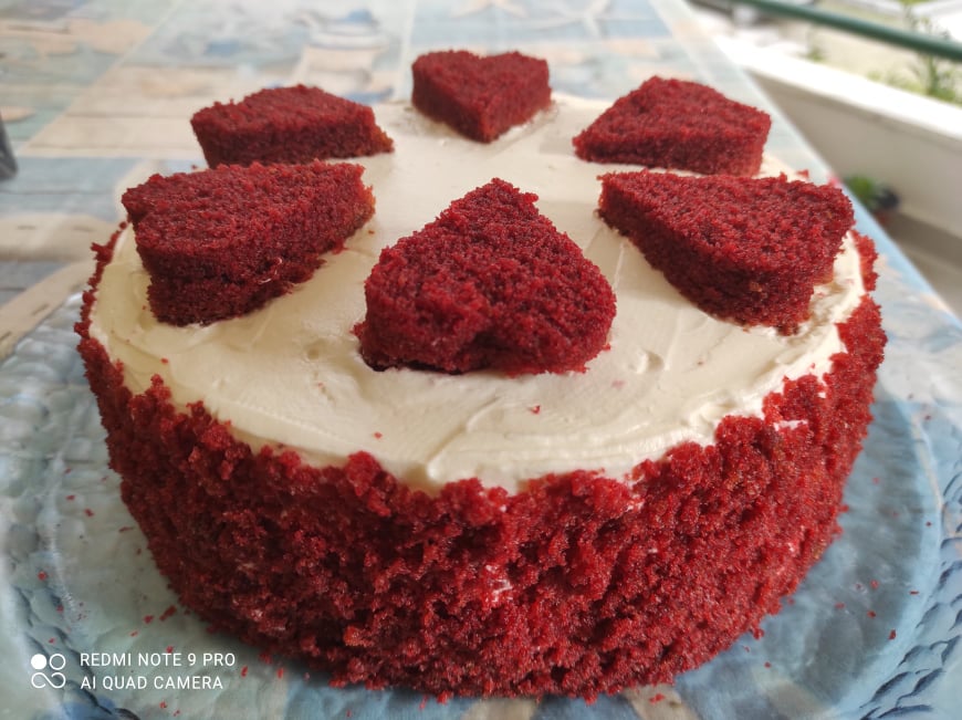 Αυτό που μένει το θρυμματίζουμε και το βάζουμε γύρω γύρω να στολίσουμε το κέικ μας.Τις καρδούλες θα τις τοποθετήσουμε στο πάνω μέρος του κέικ.