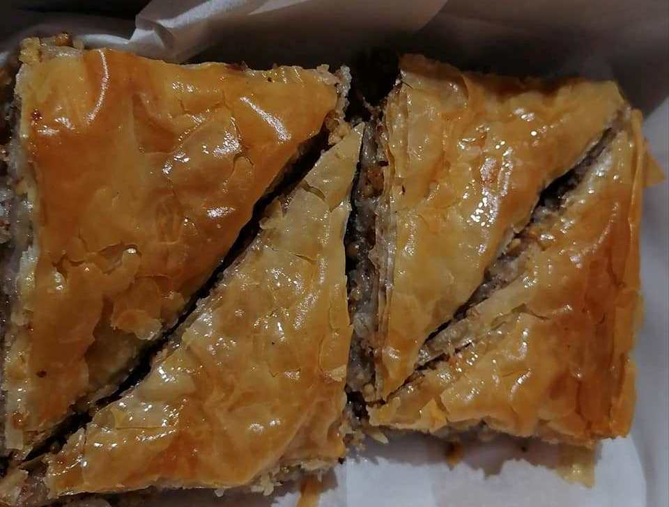 Βάζω λαδι στο ταψί και στρωνω 4 φύλλα αφού τα λαδωσω ένα – ένα. Στο 4ο φύλλο ρίχνω καρυδια, στρωνω 2 φύλλα λαδωμενα και βάζω ρύζι. Συνεχίζω εναλλάξ 2 φύλα καρύδια, δύο φύλλα ρύζι ( πάντα τα φύλλα τα λαδωνω). Φροντίζω να τελειώσω στην τελευταία σειρά με καρύδια. Στρωνω από πάνω 4 φύλλα, χαρασω σε τετράγωνα κομμάτια (5 επί 4)και μετά στη μέση διαγωνια. Βγαίνουν 40 κομμάτια στο μεγάλο ταψί. Εγώ έκανα κι ένα μικρότερο με μισή δόση.Ψηνω 50 λεπτά αέρα 180 β Σιροπιαζω και την κόβω αφού κρυώσει!!!