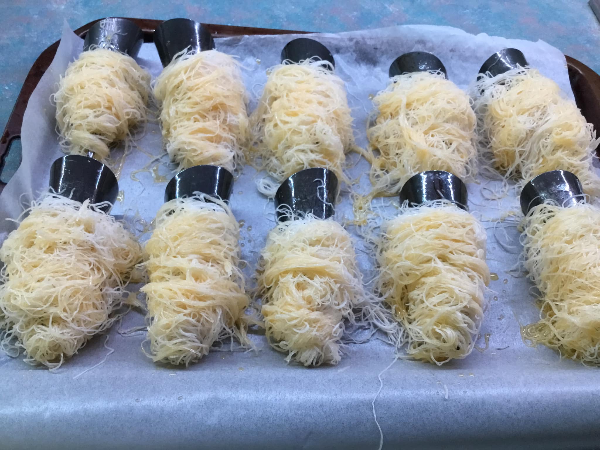 2. Συνεχίστε με το υπόλοιπο κανταΐφι έως ότου όλοι οι κώνοι γεμίσουν και βουτυρωθούν καλά.