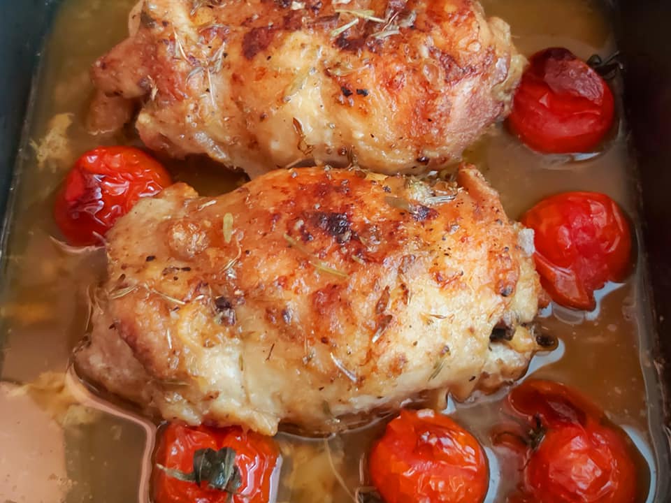 όμορφα με το κοτόπουλο, νερό, προσθέστε ντοματίνια.