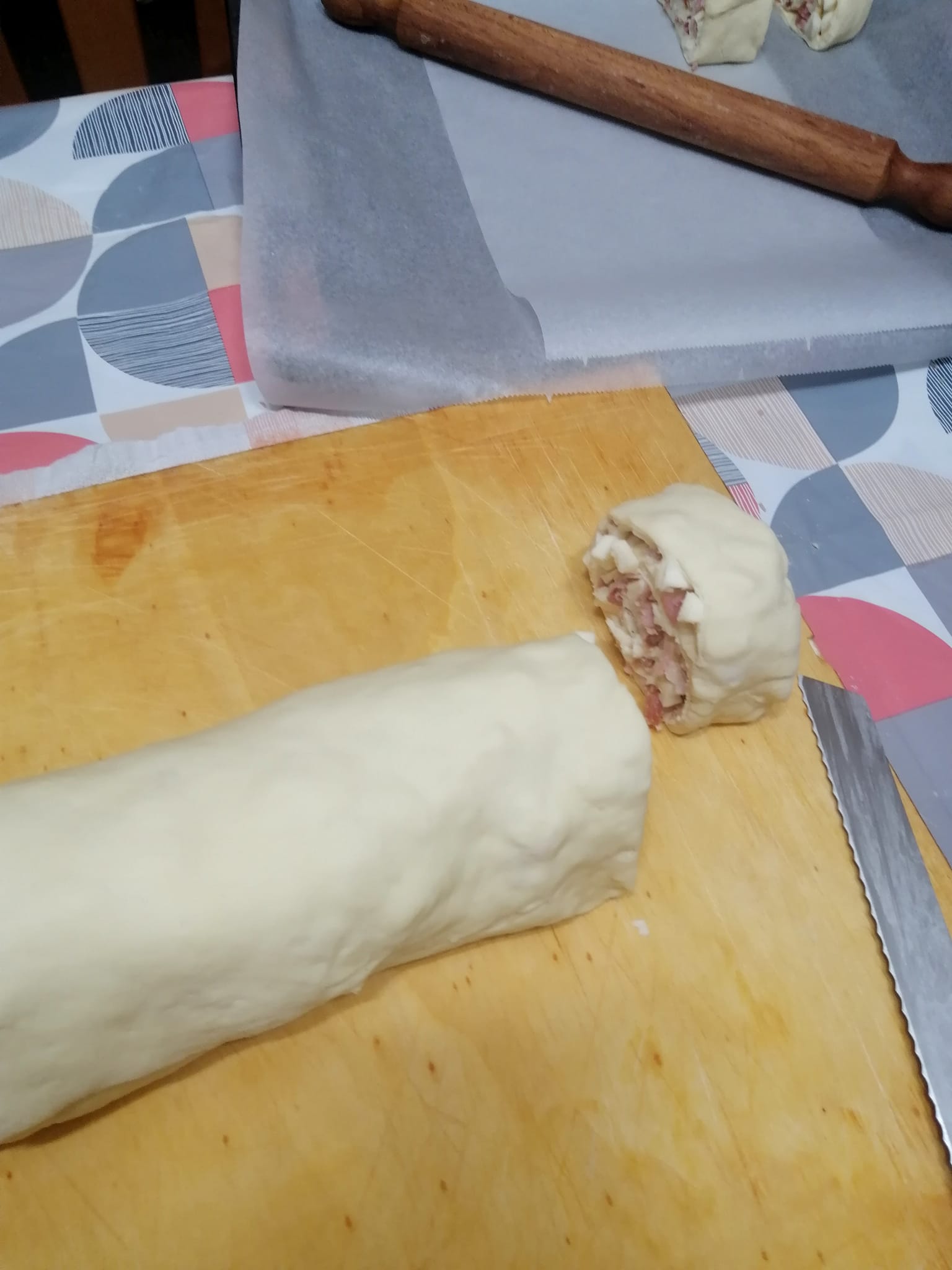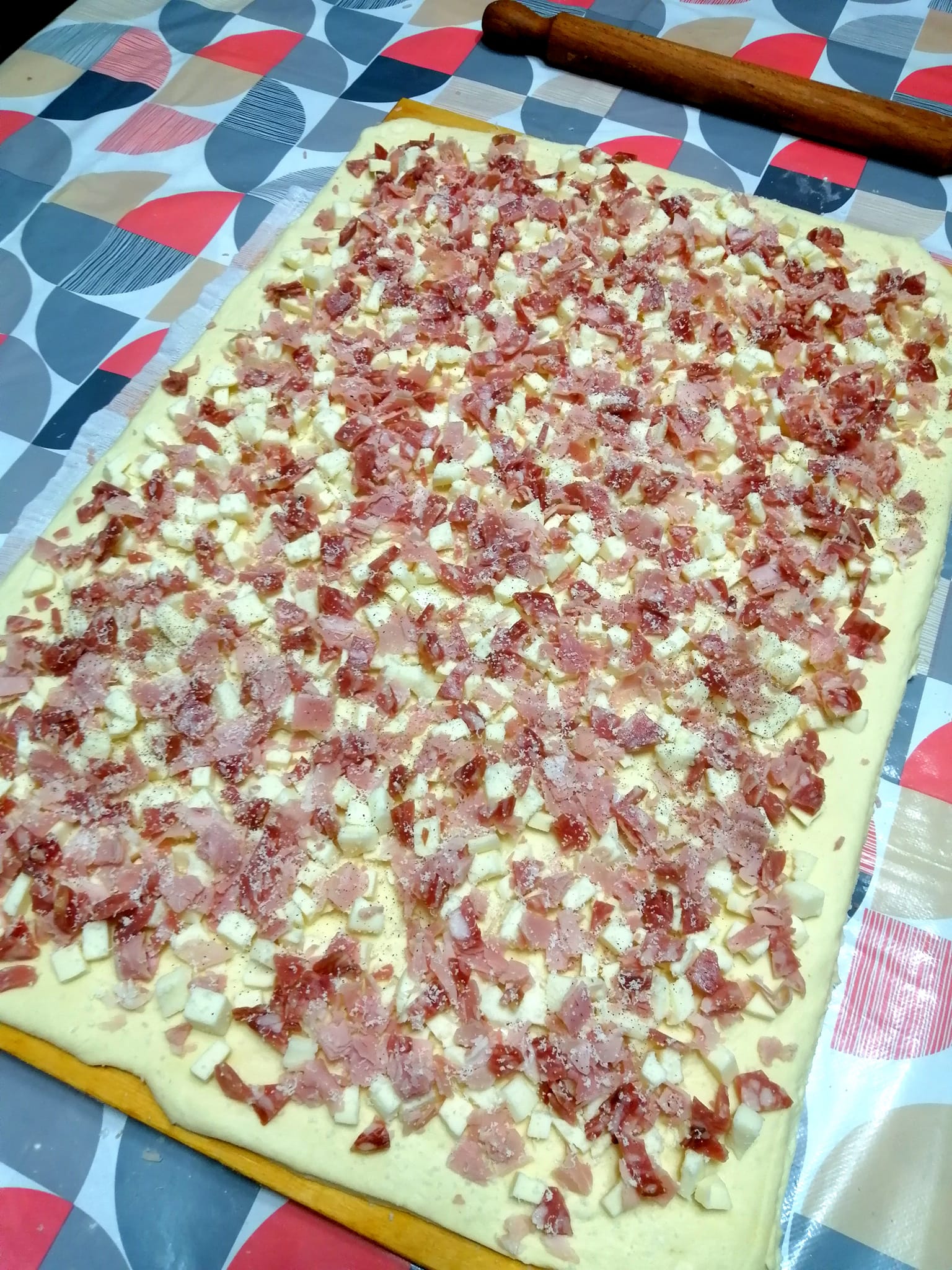 Όταν ο όγκος διπλασιαστεί, ανοίγετε τη ζύμη προσπαθώντας να σχηματίσετε ένα ορθογώνιο παραλληλόγραμμο- στη βάση απλώνετε το ζαμπόν, το σαλάμι και το τυρί , αν προτιμάτε προσθέτετε και βραστά αυγά.