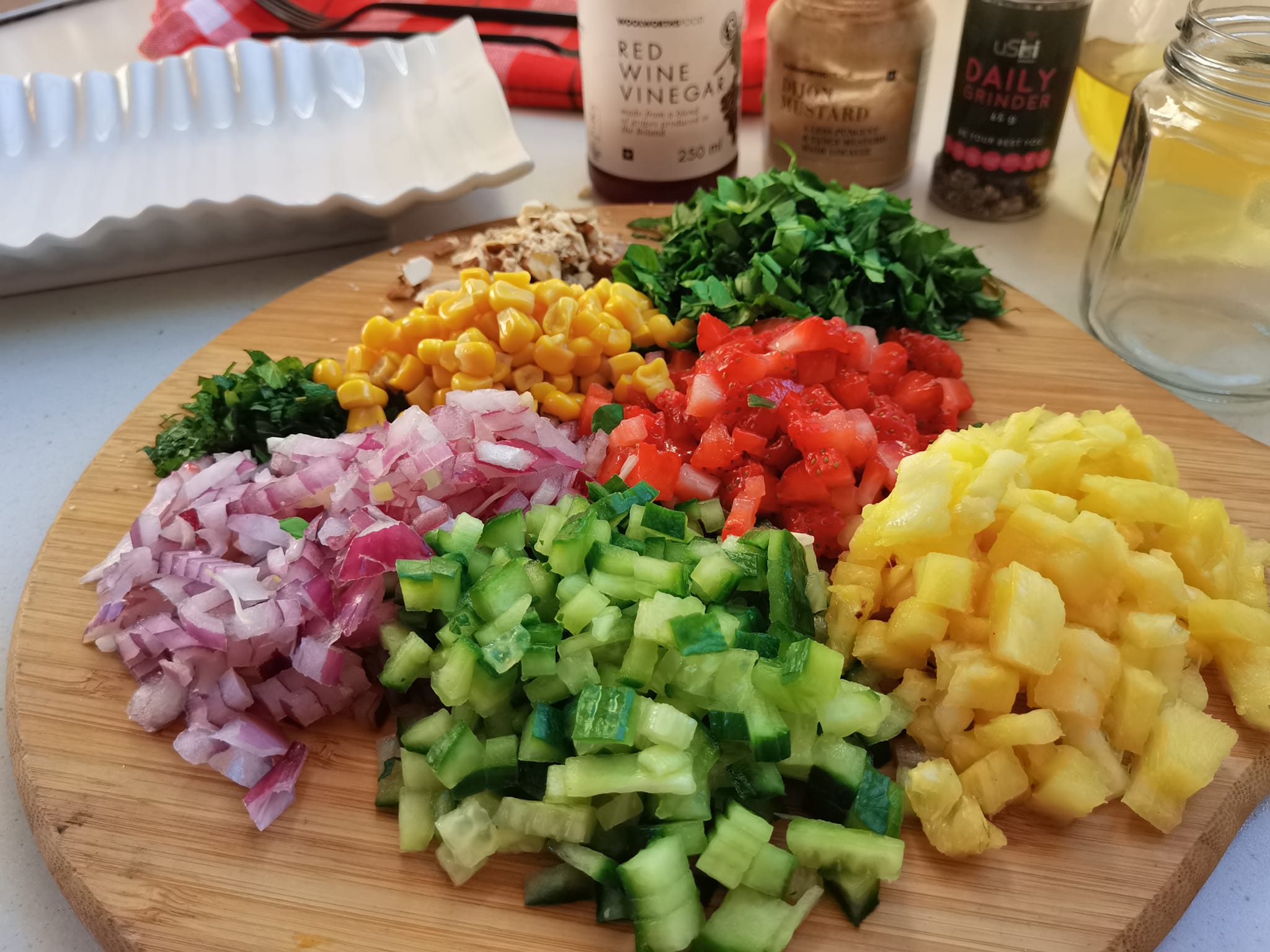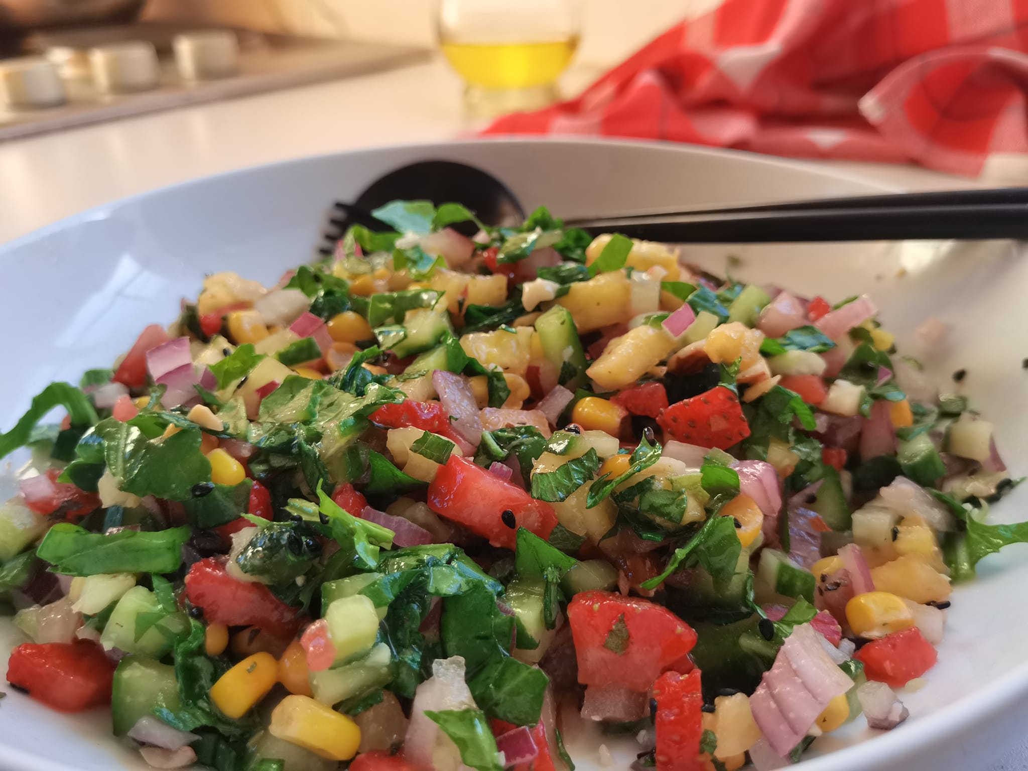 Αυτή η σαλάτα συνδυάζει δροσερά υλικά με γλυκιά και αλμυρή γεύση, δημιουργώντας μια ακαταμάχητη γευστική εμπειρία. Η ροκα προσφέρει μια πικάντικη πινελιά, ενώ το γλυκό καλαμπόκι και ο ανανάς προσθέτουν γλυκύτητα. Οι φράουλες και το αγγούρι χαρίζουν φρεσκάδα, ενώ το κόκκινο κρεμμύδι προσθέτει μια πινελιά τσαχπινιά. Τέλος, τα θρυμματισμένα αμύγδαλα δίνουν μια ωραία τραγανή υφή.