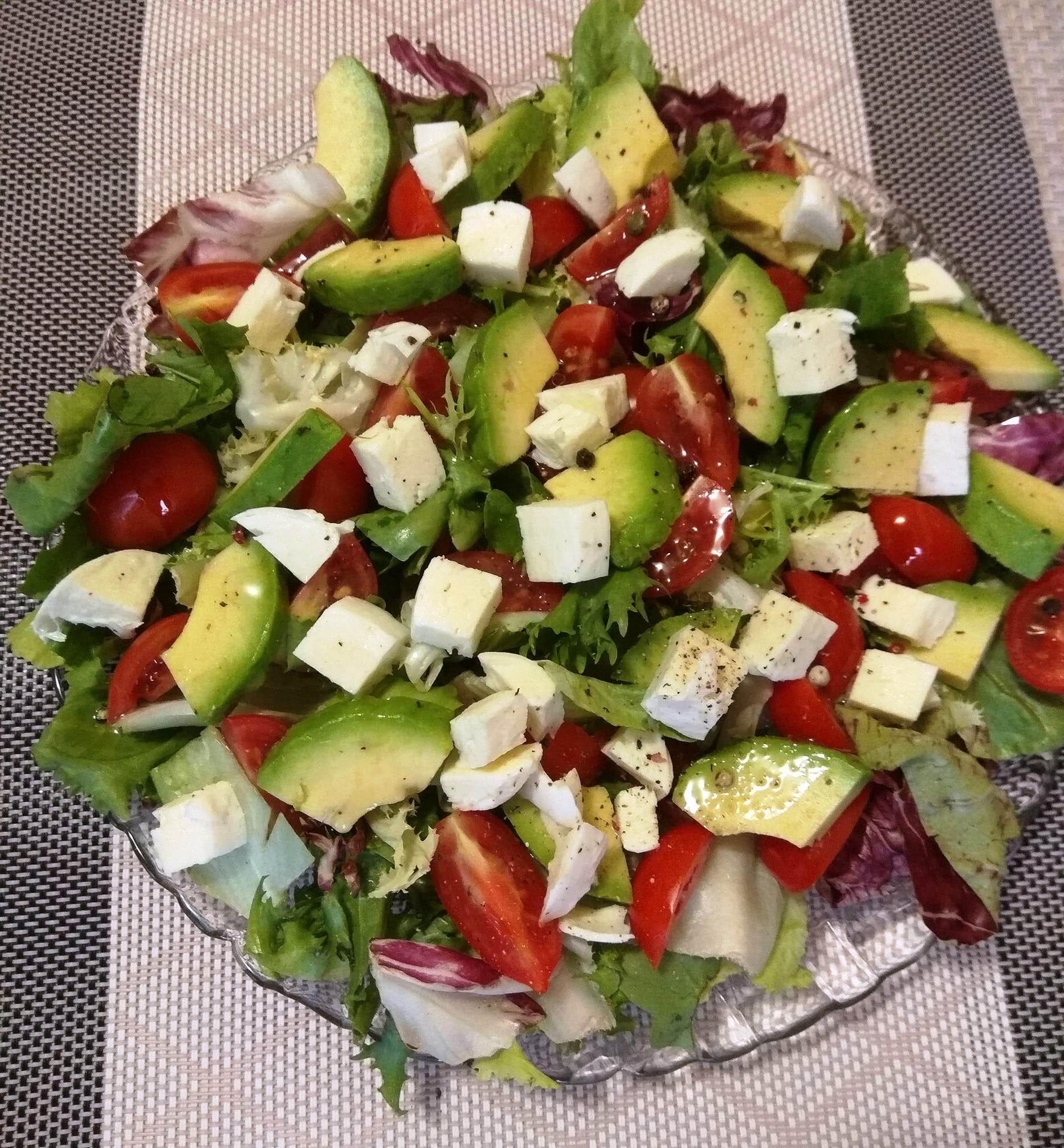 - Σε ένα μπολ, βάζουμε το μαρούλι, το αβοκάντο, τη μοτσαρέλα ή τη φέτα, τα ντοματίνια, αλάτι, πιπέρι και ελαιόλαδο.