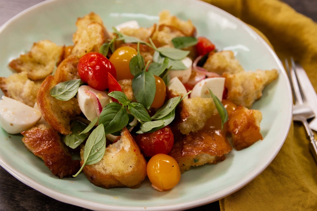 Σαλάτα με ψωμί ψητές ντομάτες και μοτσαρελα ή φέτα