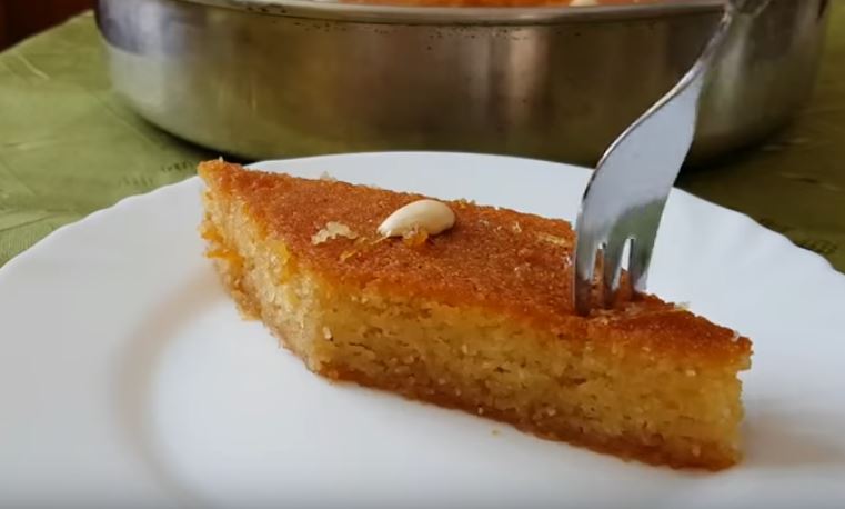 Βάζουμε όλα τα υλικά σε μία κατσαρόλα και το βράζουμε για 5 λεπτά και θα το αφήσουμε να κοχλάζει για να λιώσει η ζάχαρη χωρίς ανακάτεμα(μονο κούνημα της κατσαρόλας) και θα είναι έτοιμο. Αφού το γλυκό μας έχει κρυώσει θα πάρουμε το καυτό σιρόπι και θα το ρίξουμε από πάνω με μία κουτάλα σιγά σιγά. Θα το αφήσουμε να πιει εντελώς το σιρόπι του και να κρυώσει τελείως. Τέλος το κόβουμε σε κομμάτια και το διακοσμούμε με ένα αμύγδαλο σε κάθε κομμάτι ή με τριμμένη καρύδα