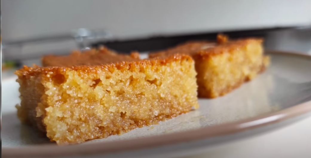Λαδώνουμε ένα ταψακι 25χ37 εκ καλά και αδειάζουμε μέσα το μείγμα του σιμιγδαλιού το οποίο και το απλώνουμε και το ισιώνουμε σε μία λεία επιφάνεια
