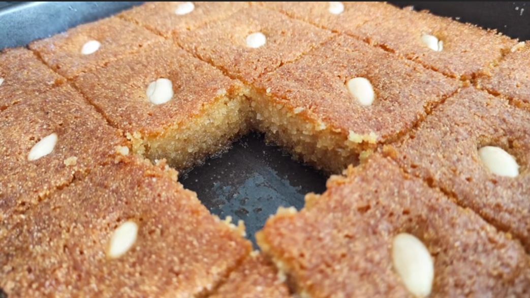 Καθαρίζουμε τα αμύγδαλα από τη φλούδα τους, χαράζουμε το σιμιγδάλι σε κυβάκια και προσθέτουμε ένα αμύγδαλο πάνω από κάθε κυβάκι.