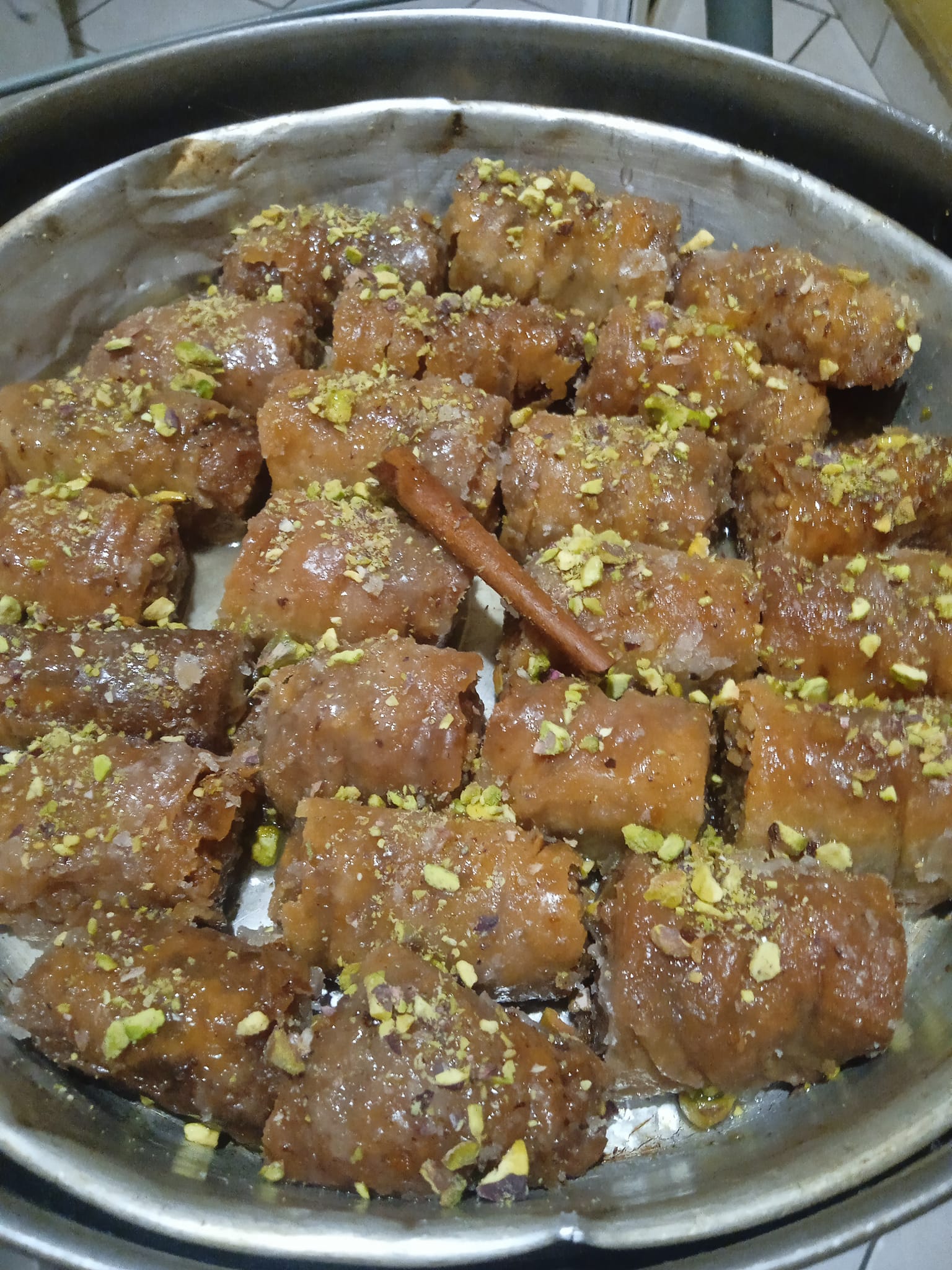 Αφού κρυώσει, περιχύνουμε τα σαραγλακια με χλιαρό σιρόπι από νερό και ζάχαρη και πασπαλίζουμε με τριμμένο καρύδι ή φυστίκι αιγίνης.