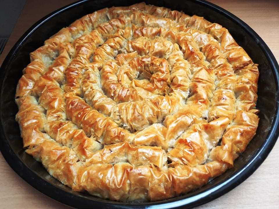 Τοποθετούμε την κρούστα σε κατάλληλο στρογγυλό ταψί απο το κέντρο προς τα εξω και συνεχίζουμε με τον ίδιο τρόπο μέχρι να γίνουν