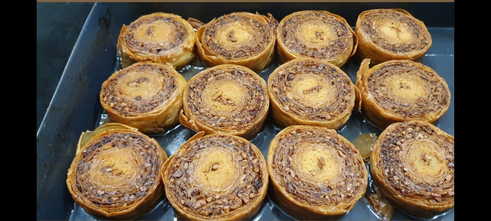 Έτσι, έχω φτιάξει ένα ρολό πάχους 10 εκ., με 10 φύλλα και 4 στρώσεις καρύδια. Τοποθετώ το ρολό μέσα στην ειδική θήκη που έφτιαξα και το κόβω σε στρογγυλά κομμάτια πλάτους 4 εκ. Βουτυρώνω το ταψί και ψήνω στους 160°C για 1,5 ώρα.