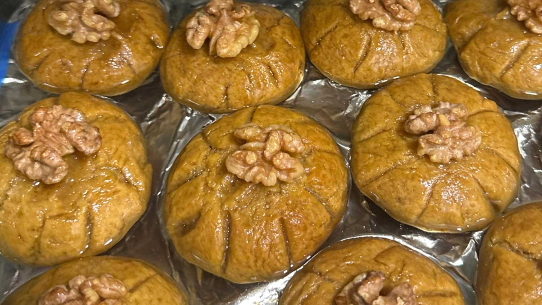 Μεταφέρουμε τα κομμάτια από τη ζύμη σε δυο ταψιά στρωμένα με λαδόκολλα και βάζουμε 1 αμύγδαλο στο κέντρο κάθε κομματιού πιέζοντας ελάχιστα για να δημιουργήσουμε ένα βαθούλωμα και ψήνουμε σε φούρνο προθερμασμένο στους 180 βαθμούς για περίπου 20-25 λεπτά.