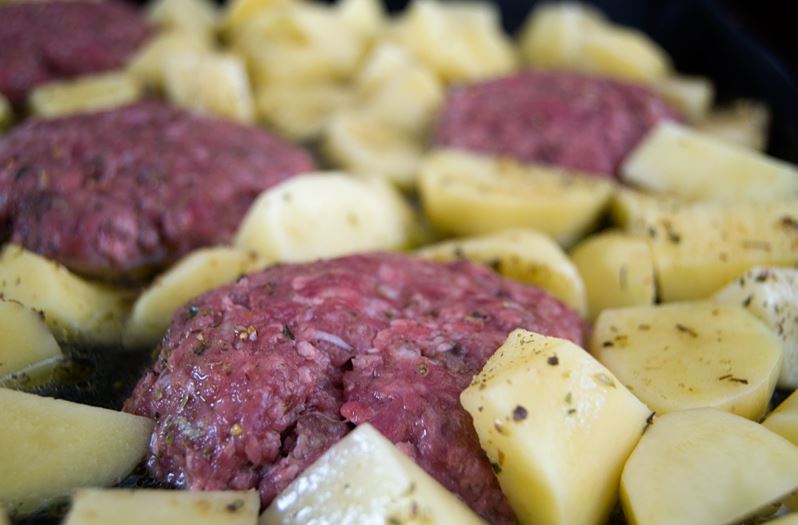 Συμβουλή: Φροντίστε να ανακατεύετε τις πατάτες κάθε 15 – 20 λεπτά και να γυρίσετε τα μπιφτέκια μια φορά στη μέση του ψησίματος.
